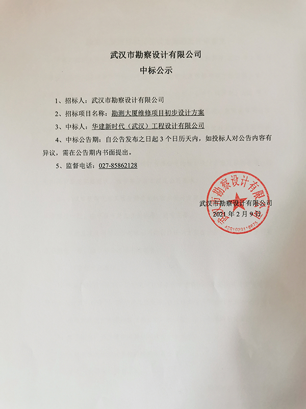 武漢市勘察設(shè)計(jì)有限公司勘測大廈維修項(xiàng)目初步設(shè)計(jì)方案中標(biāo)結(jié)果公示
