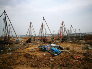 該項目場地內(nèi)分布有3個大魚塘,淤泥層厚;地形變化大,高低不平;白云巖差異風(fēng)化嚴(yán)重,鉆進難度大。針對項目工作量大、工期緊,鉆進難度大,場地條件差的特點,我公司中標(biāo)后,在3天內(nèi)組織安排技術(shù)管理人員4名、35臺鉆探設(shè)備進場作業(yè)。