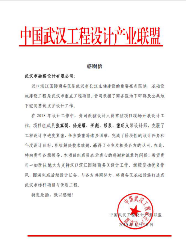 2019年1月21日,中國武漢設計產業(yè)聯(lián)盟向我司發(fā)來感謝信,對漢口濱江國際商務區(qū)基坑支護設計項目組成員一年來辛勤而卓有成效的工作表示感謝,這封感謝信代表了設計產業(yè)聯(lián)盟對我司設計工作的充分認可。